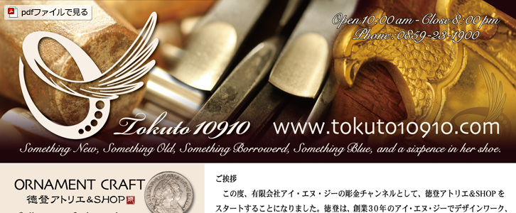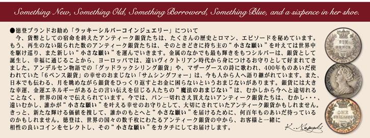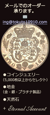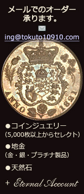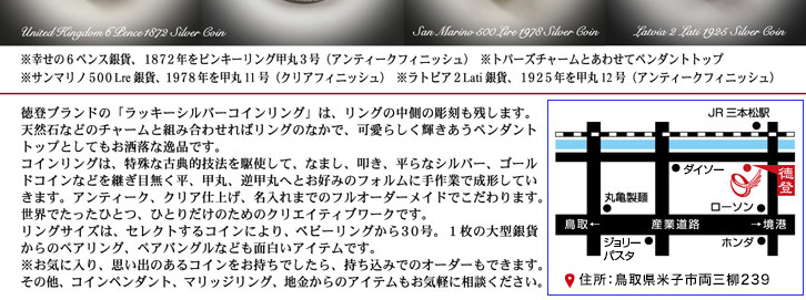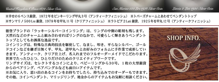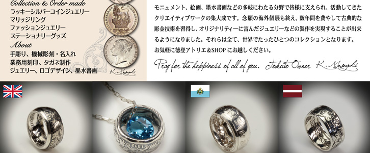 徳登(とくと)アトリエは、コインアクセサリー、シルバー、皮革製品をはじめとしたオリジナル・オーダーメイドの彫金工房です。 主にコインリング、コインペンダント、スプーンリングなどの魅力的なアート・プロダクツを販売しています。 常時5,000枚以上のアンティーク銀貨のストックの中からお気に入りのコインを選んでいただき、世界であなただけのオリジナル・アクセサリーをオーダーメイドできます。
